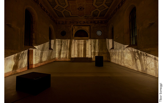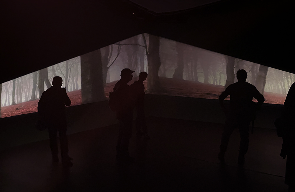 This site-specific installation holds menace and beauty in a kind of cognitive dissonance. It is both a gesture of remembrance for those who have died in the war in Ukraine and a lament for the destruction of the natural environment that accompanies all wars. The title is from a poem by Anastasia Afanasieva, one of many contemporary Ukrainian writers exploring how – and if – poetry can respond to the Russian invasion of their country. Denise Hawrysio and John Wynne experimented together for a month in this former synagogue in Slovakia to ask the same question of art. The devastating effects of the war on nature are catastrophic, and mirror the simultaneous human tragedies wrought by this pointless aggression. As Yevheniia Zasiadko from Ecoaction, a Ukrainian environmental group says, “War affects our nature just as badly as our people and our infrastructure. However, this damage remains unseen and mostly ignored, for the environment is the silent victim.” In the lower gallery, a slow tracking shot of a forest is accompanied by powerful low frequency sounds that are sometimes more felt than heard. Wynne exploits the resonant frequencies of the space with shifting microtonal intervals that result in standing waves and beat frequencies that seem to carve and corrugate the very air we breathe. Floating in the unlocatable high frequencies are the sounds of a violin, played and recorded by Wynne in response to the remarkable acoustics of the synagogue. He was inspired by the many incongruous, heart-rending YouTube videos featuring Ukrainian soldier-violinists, one of which is projected in the upper gallery. The Women’s Gallery, upstairs, is more explicit. Hawrysio’s collages juxtapose images excised from old National Geographic magazines with contemporary war imagery from Ukraine. Unexpected links are invariably forged, producing an emotional – almost primordial – tug between revulsion and aesthetic appeal. Click to read a review by art critic Kati Havran